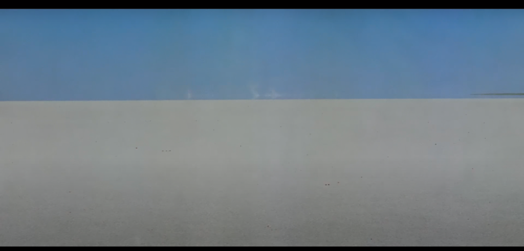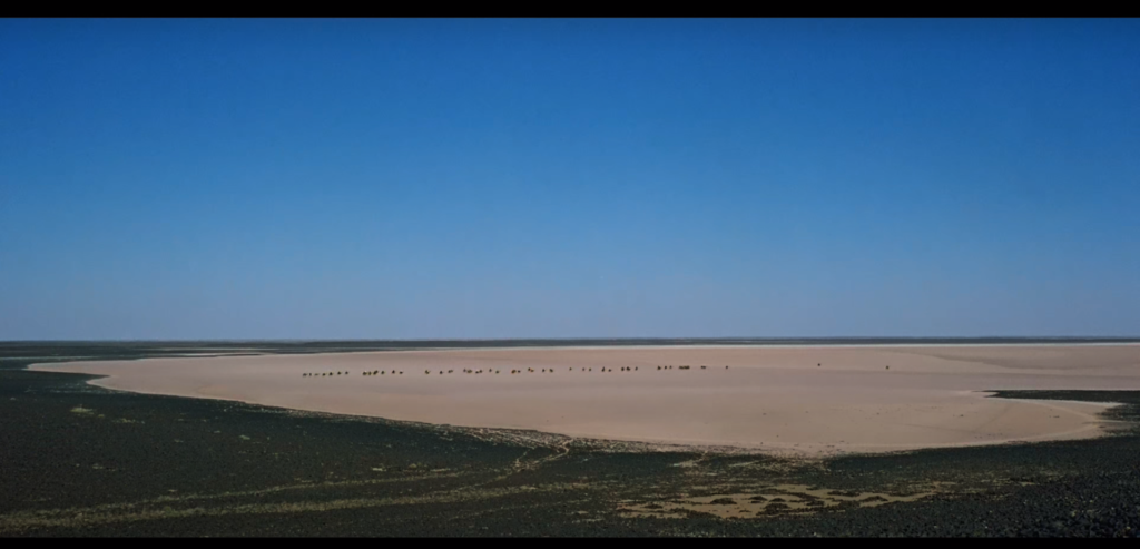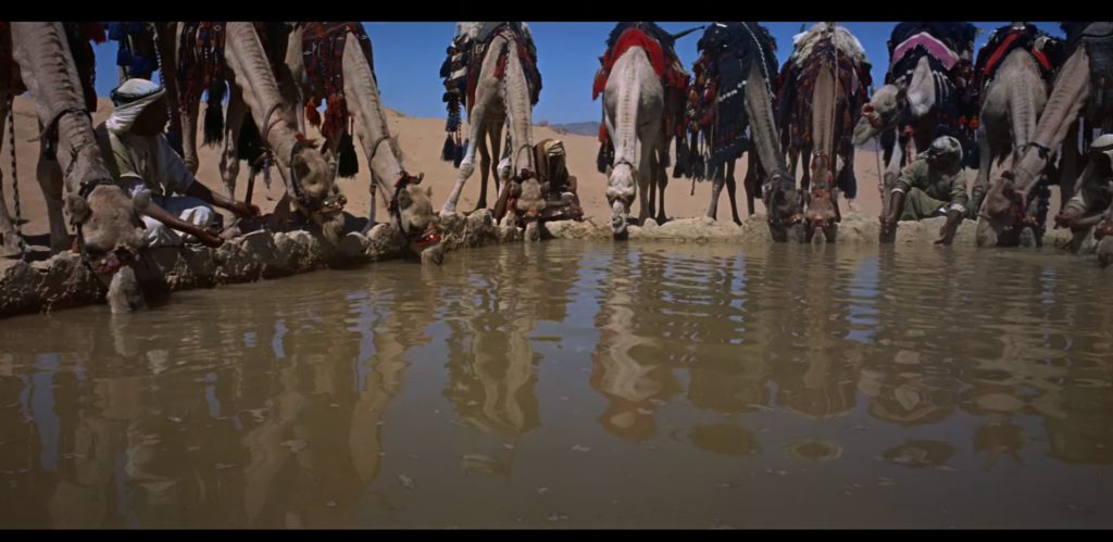 This scene captures Gasim’s reaction from exhaustion and fatigue in the blazing desert sun. Shot from a high angle, the camera captures the dry floor. The next shot incredulously cuts to camels quaffing on water from a pond.
