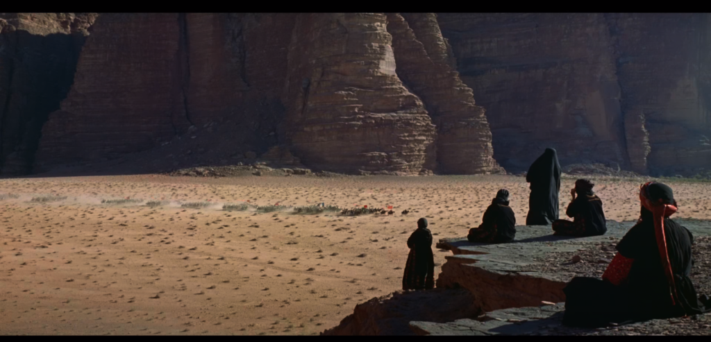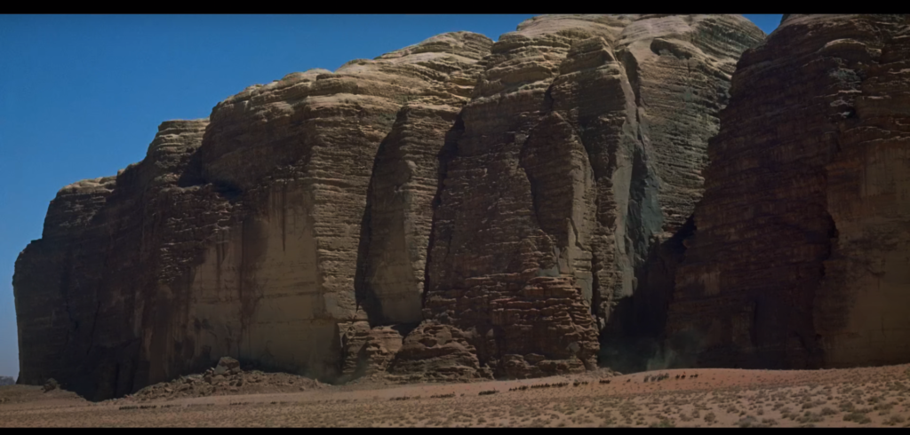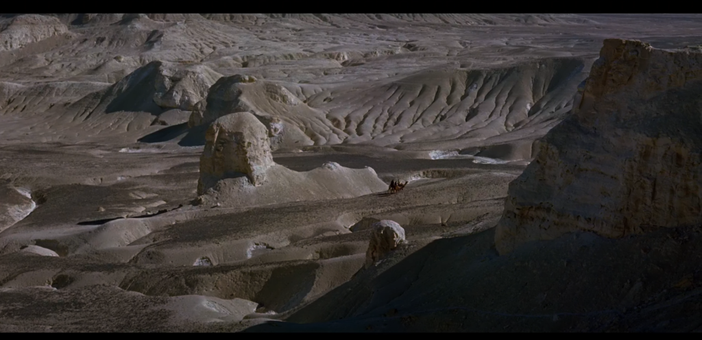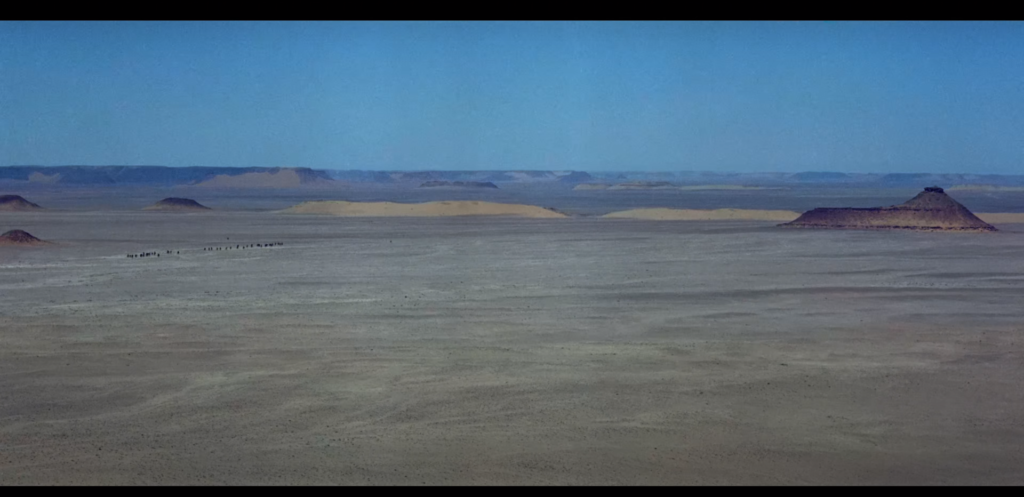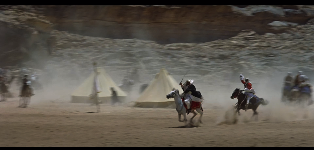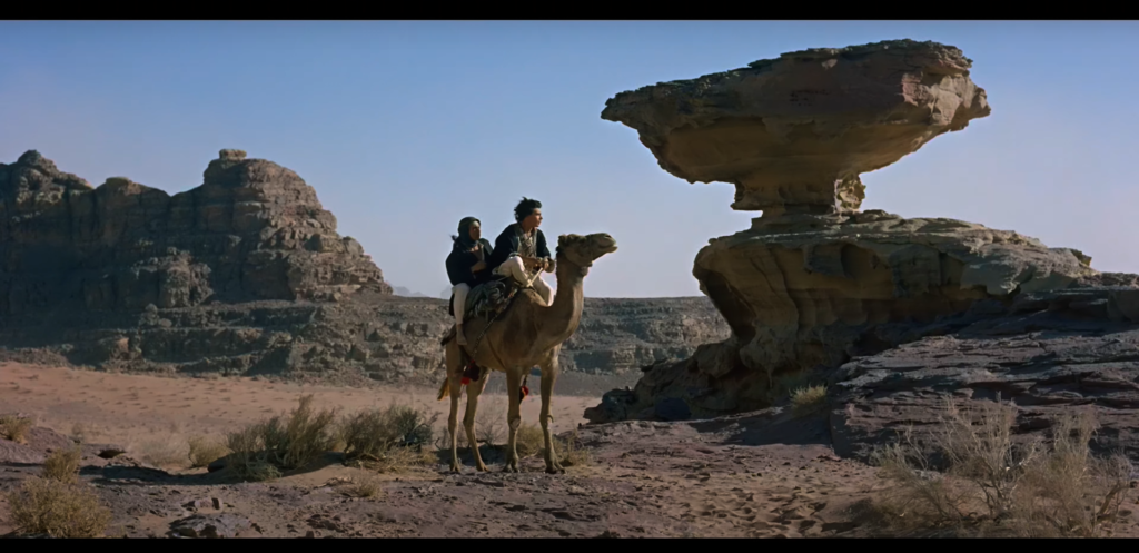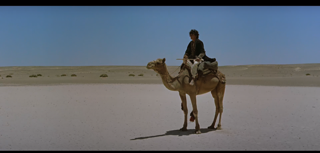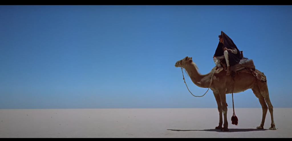 Lawrence’s (Peter O’Toole) flunky waits for him to return from the rescue. Another beautiful scene with the rich saturated blue sky in the background and the camel with its rider in sharp focus.