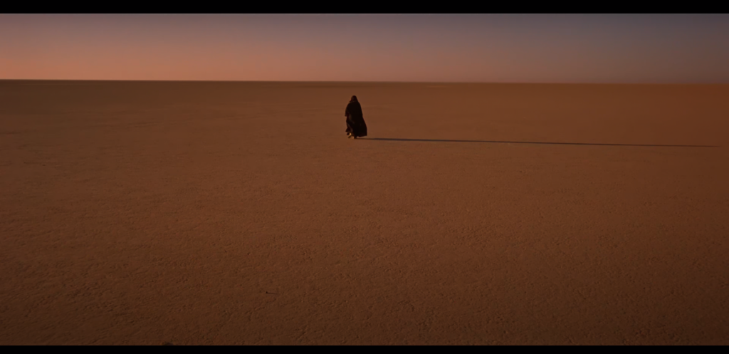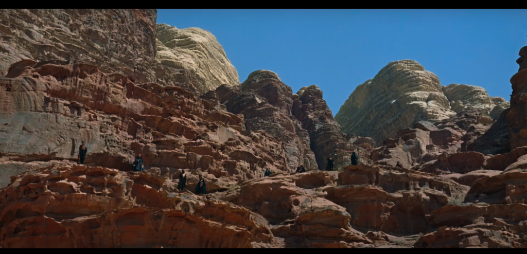 I move on as the desert and the characters draw me into the story. The desert landscapes appear as if they were plucked from a masterpiece by a great artist in sharp contrast to frames from contemporary superhero movies rich in synthetic graphics and computer-generated illustrations which one might, just might also find in a children’s coloring book.