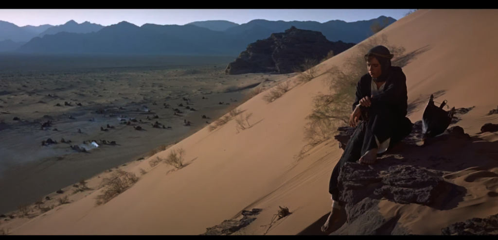 Lean leads us on to T. E. Lawrence’s (Peter O’Toole) love for the desert as he walks into the desert night to contemplate a miracle, a miracle Prince Faisal (Alec Guinness) longs for. The scene beautifully lit and shot with filters at day as can be seen from the shadows conveys a message of longing for solitude as Lawrence embraces it.