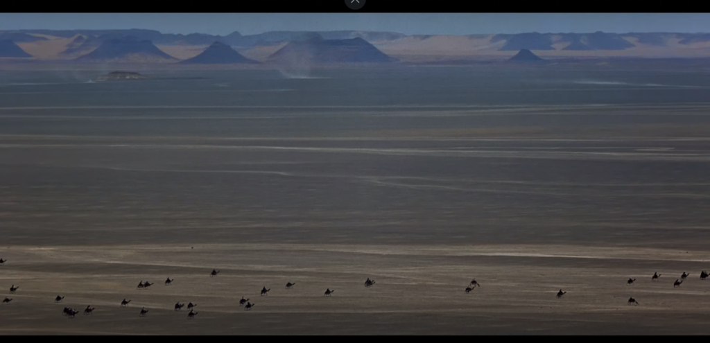 The opening scenes of the desert look warm and welcoming to the travellers and the vastness of the desert magnified by its void emptiness and silence which embraces it is felt. “The desert is clean,” says Lawrence.