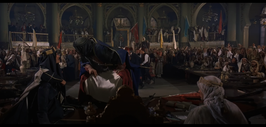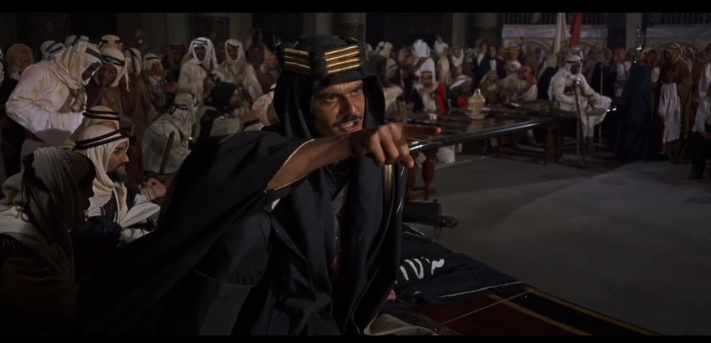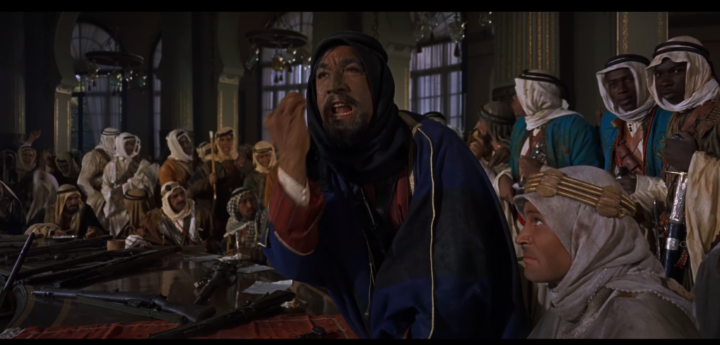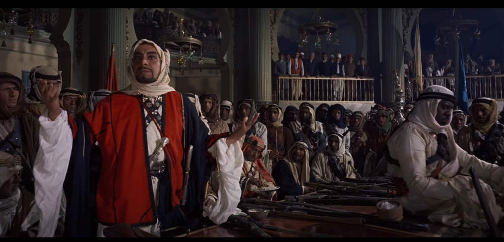 The scenes at the Arab council meeting are filled with chaos and disorder and cacophony of voices trying to outmatch the other. The utter confusion and havoc at the gathering to the dismay of Lawrence is felt by the viewer as each tribe speaks for themselves and not as a whole.