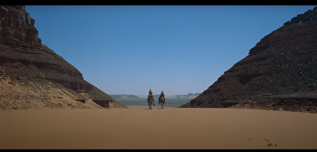 Lawrence and Tafas ride away into the distance between the hills creating a soulful onscreen rendering, a frame that could literally be hung on a wall with its perfect composition crafted out of nothing but sand and rocks.