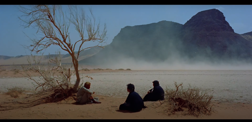 The quietness of the setting with the desolate background quickly followed by the gunshot aimed at the head of Tafas by Sherif Ali leads to Lawrence’s first encounter with Sherif Ali. The bitterness of the desert slowly reveals itself.