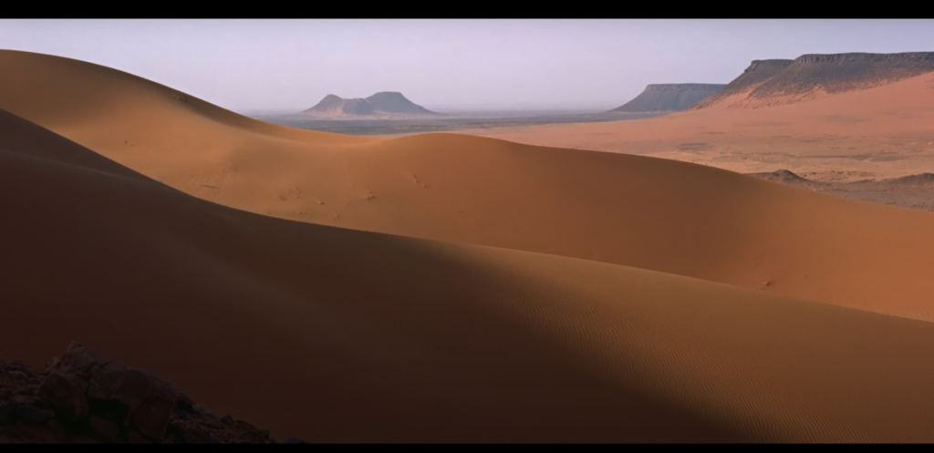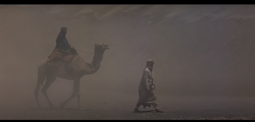 The shots where we have desert dunes which always seem to be unspoiled without even the lightest of tread marks beyond what is made by the desert wind and the footprints of the camels. And of sand displaced by the temperament of nature which encases the landscape.