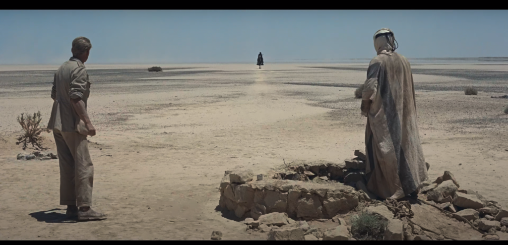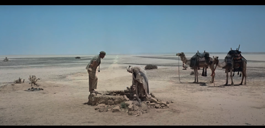 The discovery of the only water-well for miles on their journey to find Prince Faisal (Alec Guinness) and the entry of Sherif Ali (Omar Sharif) through the mirage is flawless in every aspect. This scene shot with a 500 mm Panavision lens stands apart from contemporary scenes in the history of filmmaking. Sherif Ali emerges from the distant horizon as a speck, slowly becoming larger and larger until he looms upon Lawrence and Tafas as a threat.